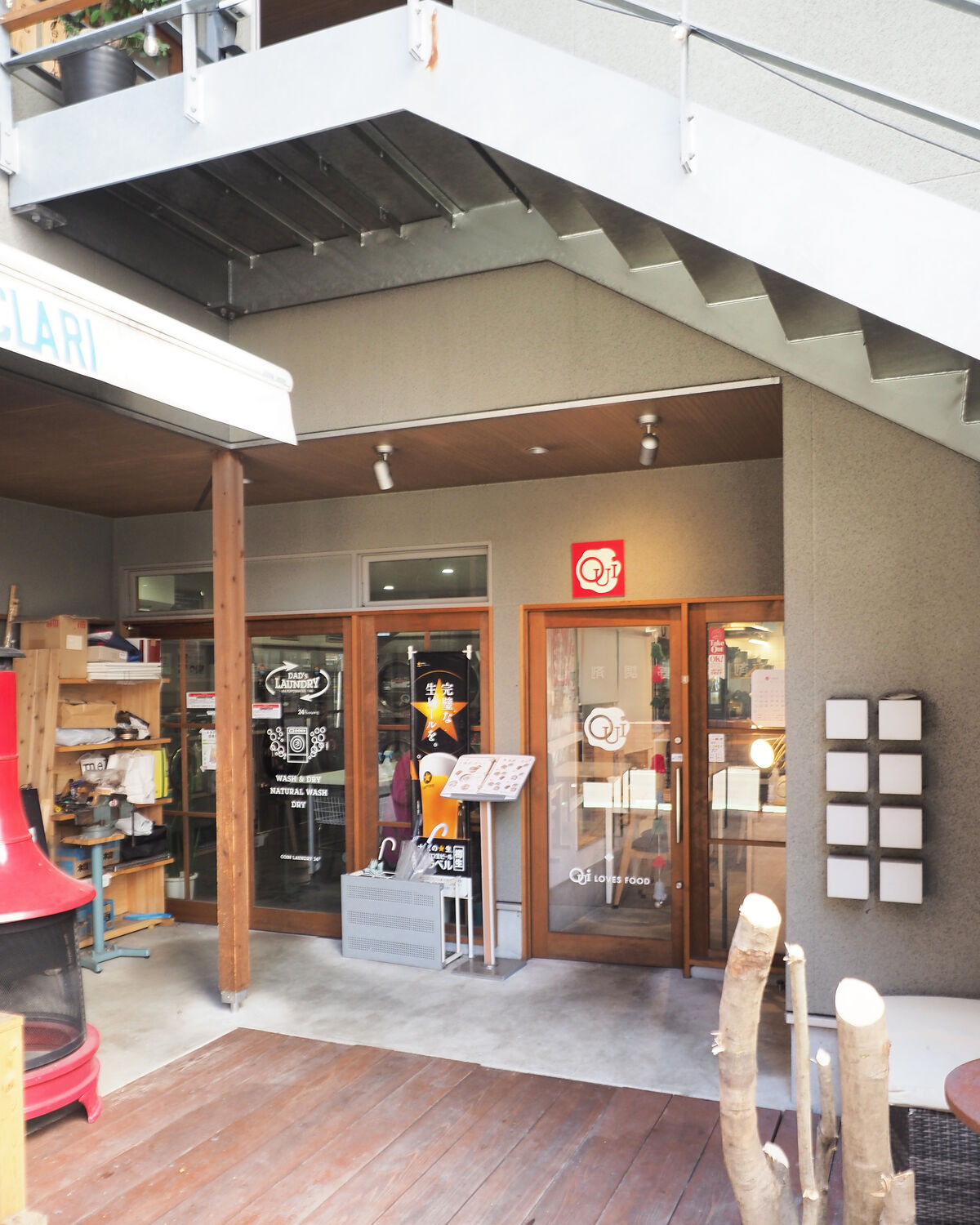 アパートにも見える施設にはコインランドリーを中心に飲食店のほか私設図書館や自転車のシェアリングサービスなどが集まります