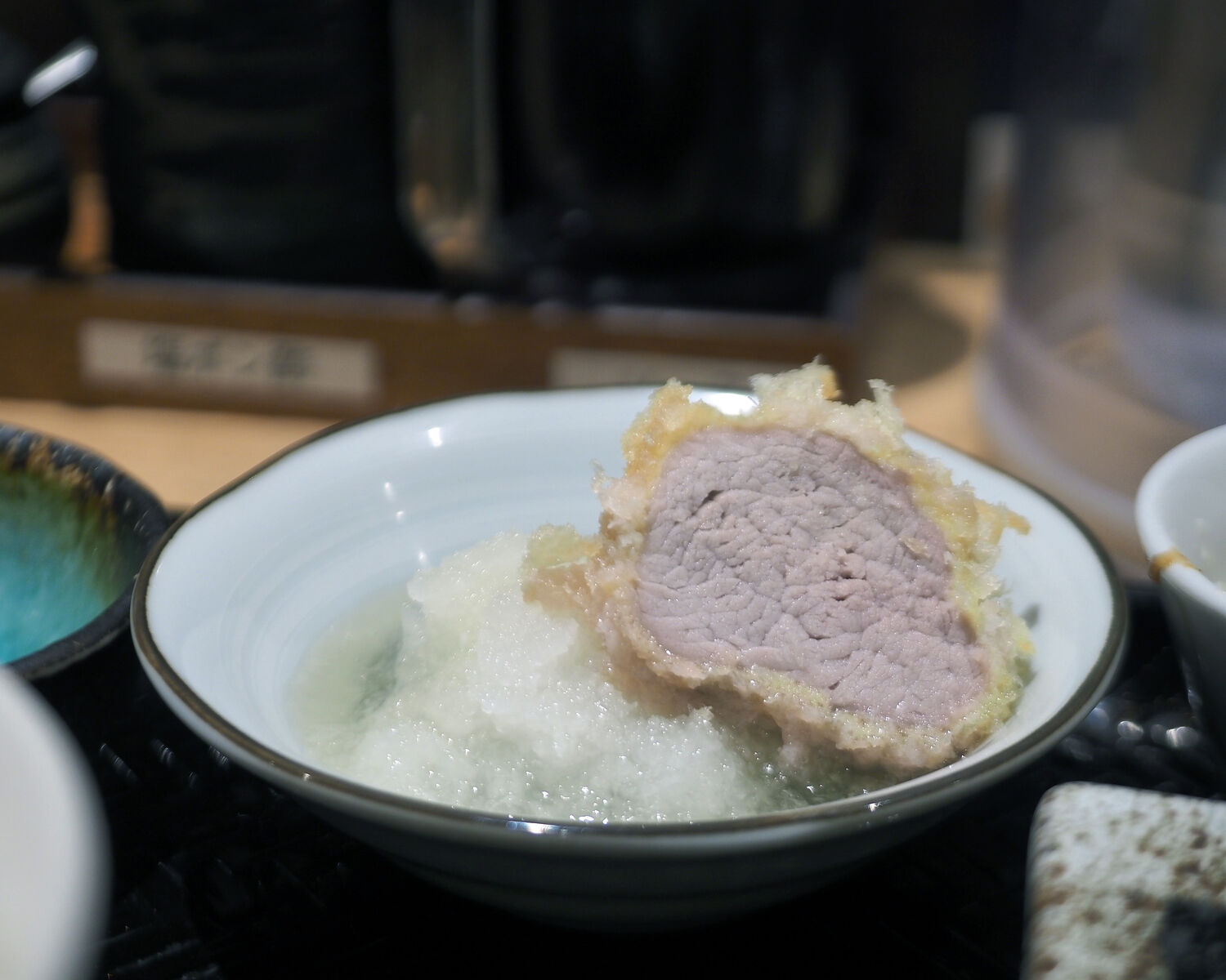 低温の油でじっくりと揚げられることから提供まで30分ほど待つことになりますが、それを補っても余りある逸品でありまして、揚げられたお肉は断面に薄ピンク色を残していますが決して生ということではなく…