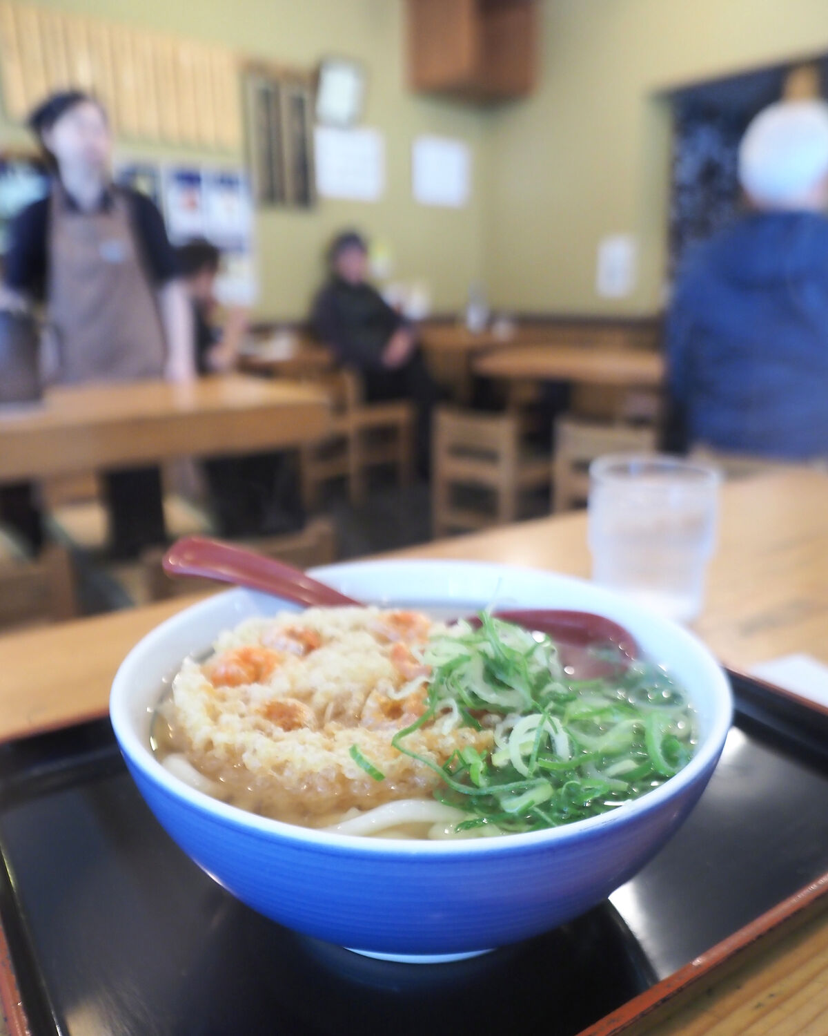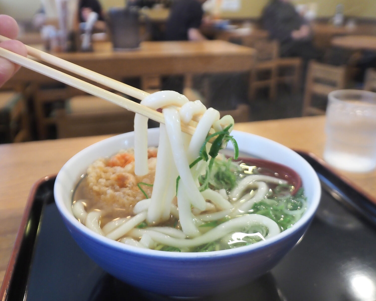博多うどんらしく柔らかく茹でられたうどんと煮干しいりこのお出汁がおいしいおつゆ そしてサクサクっとしていながらおつゆにとろける天ぷらには海老の香ばしさもあって…