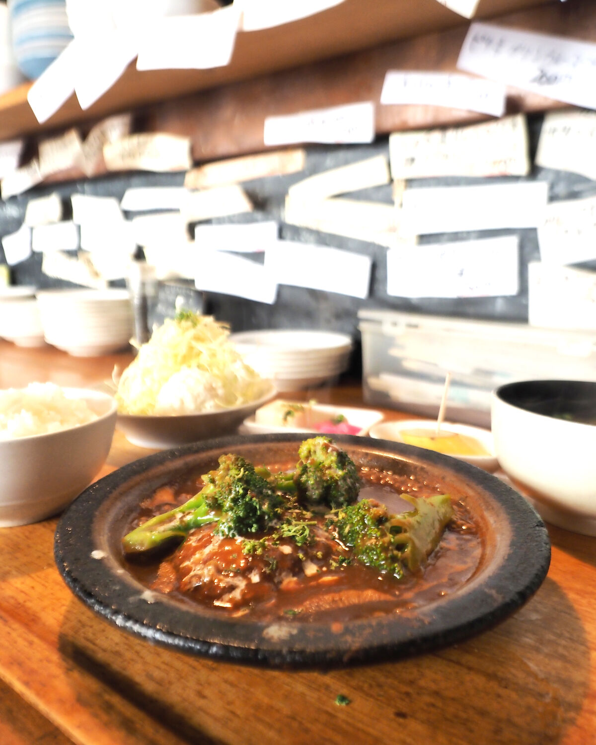 陶板のお皿で沸き立つデミグラスソースで煮込まれたハンバーグは小ぶりにも思えますが、粗挽きのミンチも混ぜられているようでお肉の歯ごたえを感じることもできますし、しっとりとジューシーな感覚もあって…