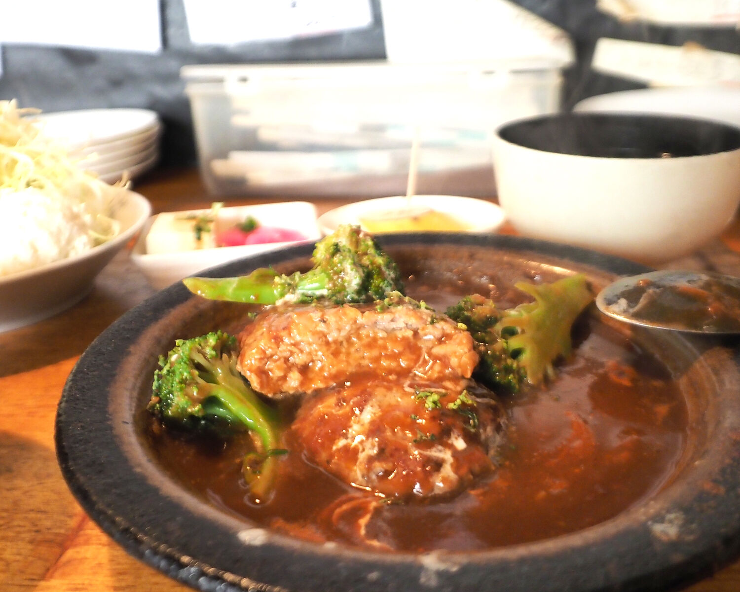 ランチメニューからいただいた「煮込みハンバーグ」はグツグツと沸き立つデミグラスソースに埋もれていました