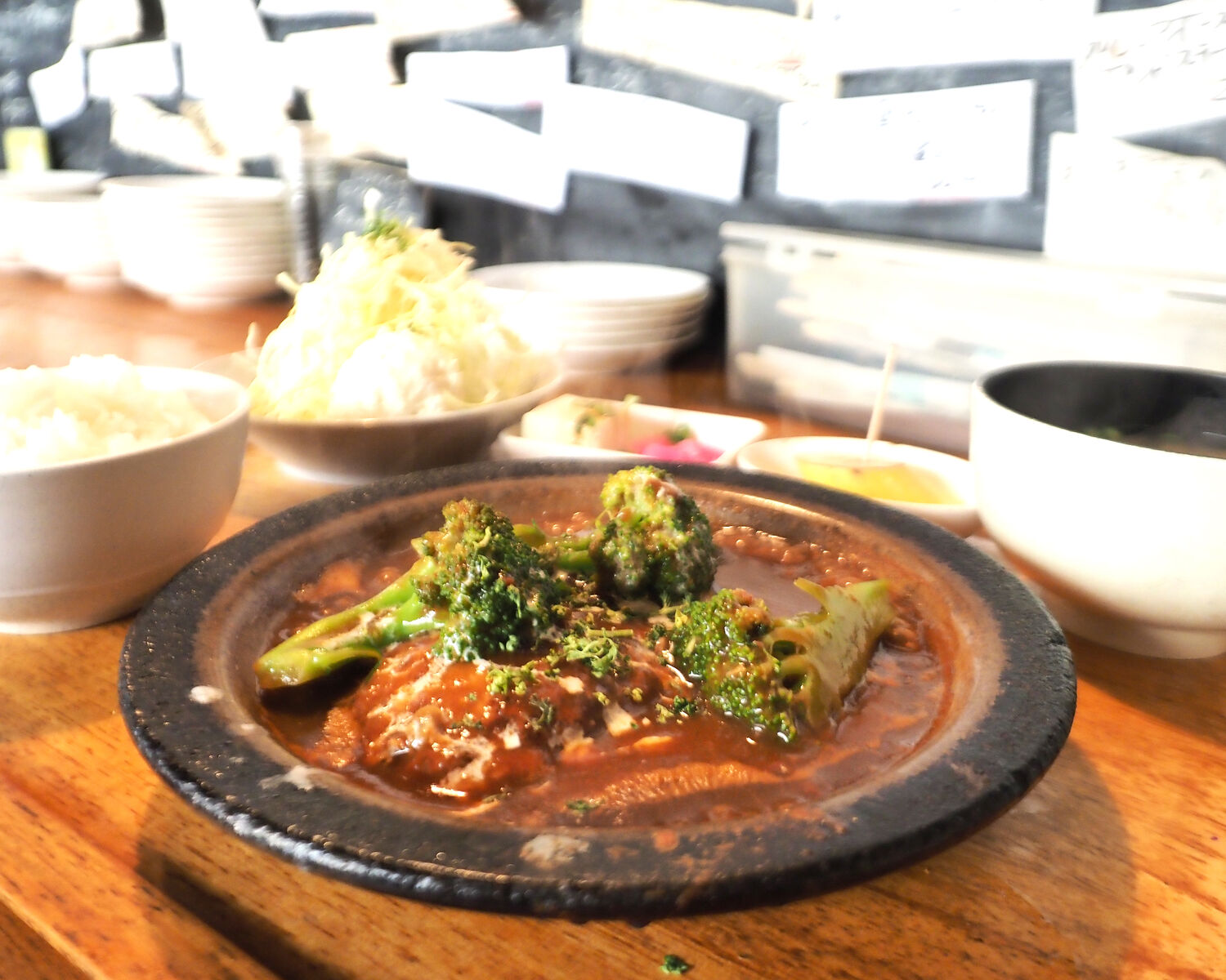 ポストイットが貼られるワタシのパソコン周りのように所狭しとメニュー札が貼られていますが、お昼に用意されているのは「日替わりランチ」のほか「煮込みハンバーグ」「ロールキャベツ」「ビーフカレー」と4品でありまして…
