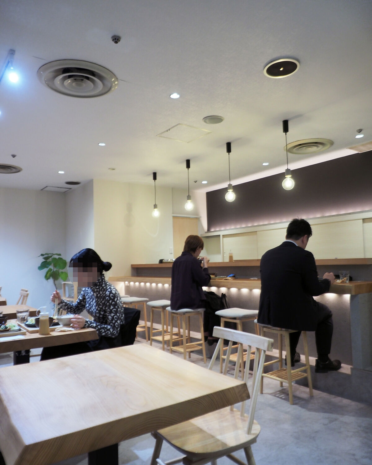 白を基調とした壁面と白木のテーブルに明るさが感じられる設えとなっていますし、2名掛けテーブルが7卓とカウンター6席も立派な天板が使われるなど上質な空間であることに居心地の良さを感じます