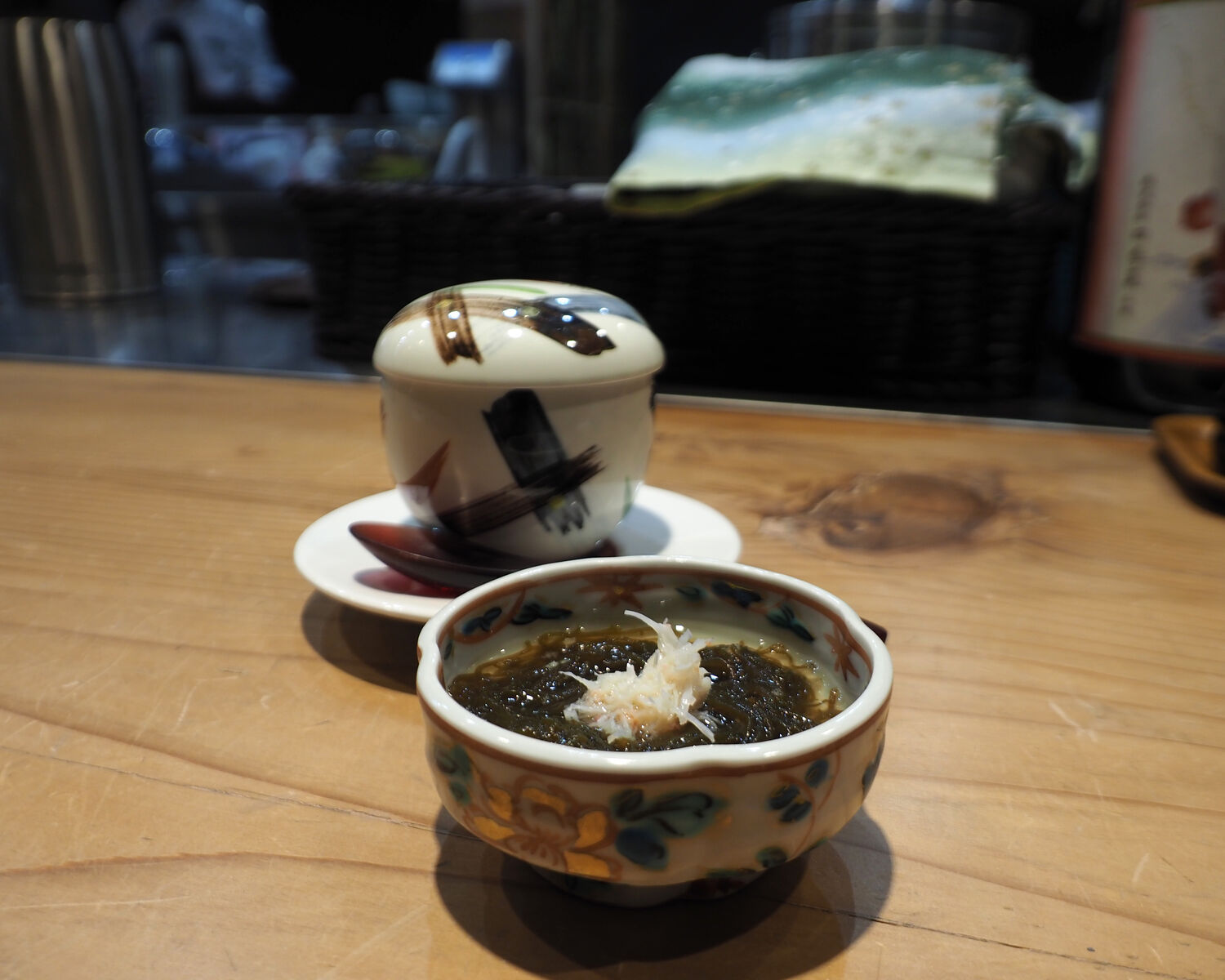 先ずは小鉢と茶碗蒸し 冷たくさっぱりといただける海蘊で食事の準備を整え茶碗蒸しをいただきますと…