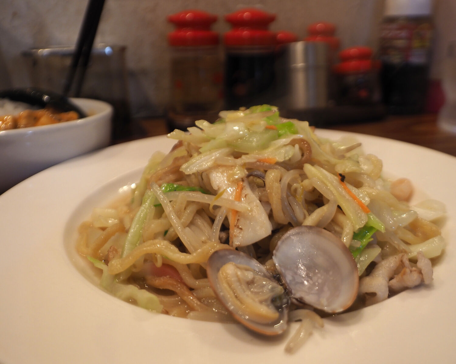 パリパリな揚げ麺の上に餡かけのちゃんぽん具材が掛けられる長崎皿うどんとは異なり、極太な麺とともにちゃんぽん具材を炒めたものでありまして…