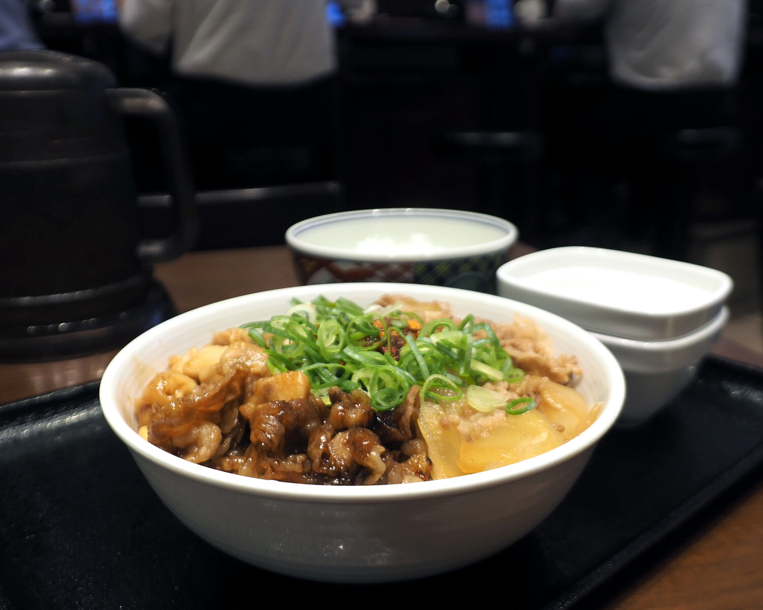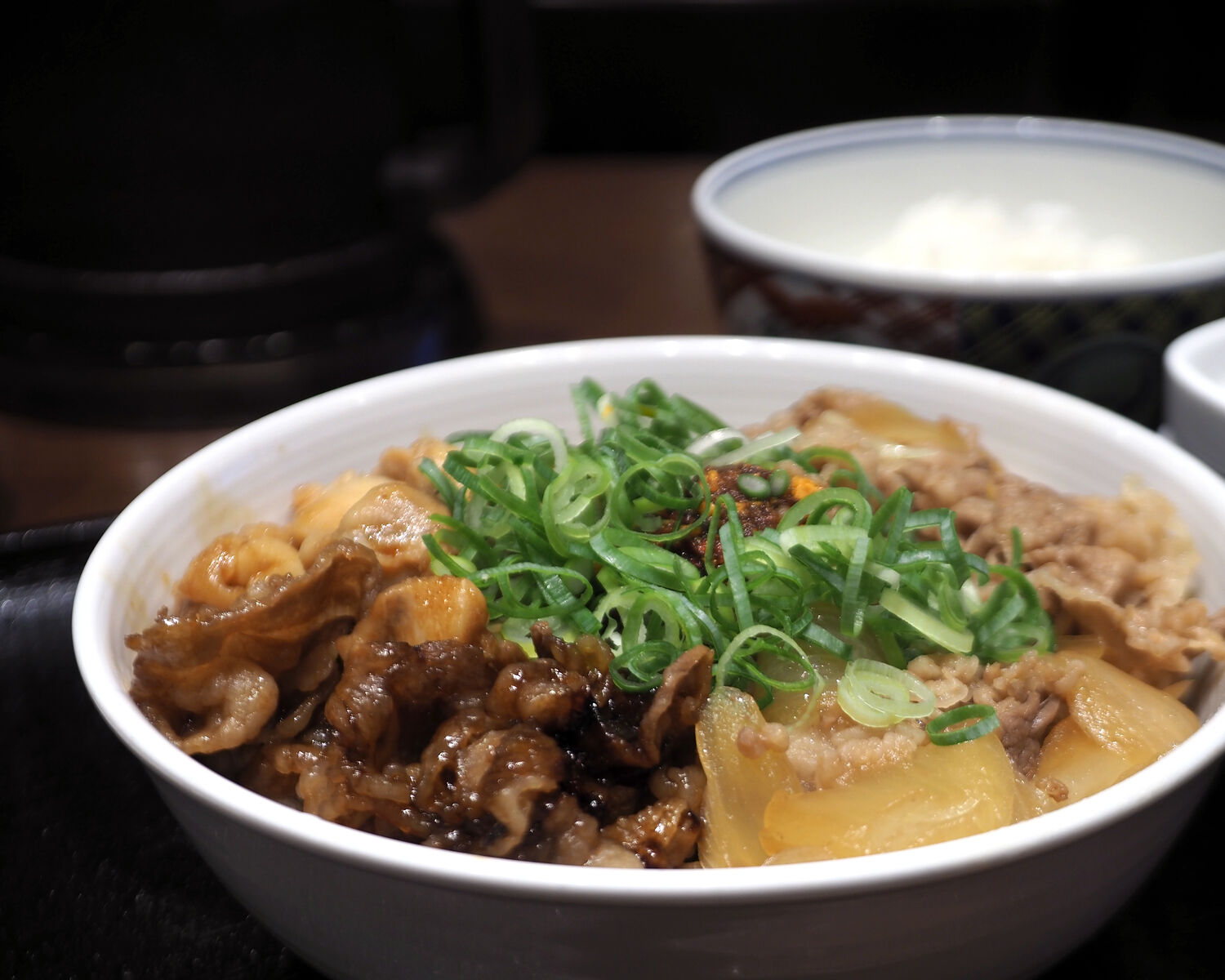 “牛肉、牛カルビ肉、鶏肉をにんにくを効かせた特製たれで仕上げ、食べるラー油で食感も楽しめます”とあることから、どんなものなのか楽しみにしていたのですが、提供されたものには既存メニューにある牛丼と牛カルビ丼が盛られているようで、オリジナルはニンニクだれで調味された鶏肉だけでありまして…