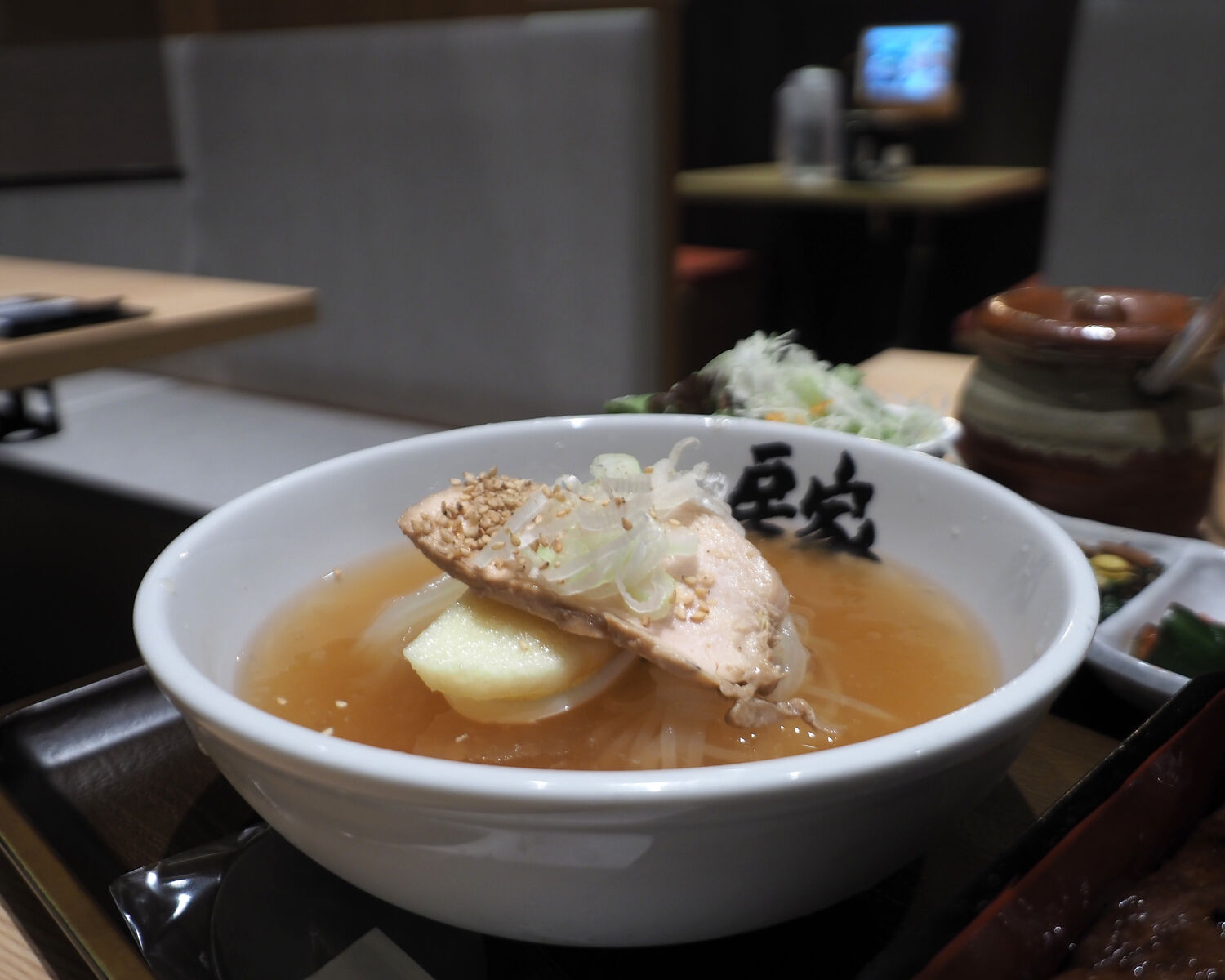 冷たく冷やされた牛骨スープに小麦粉で作るツルツルシコシコとした麺、そこにスライスされたりんごと蒸し鶏がトッピングされていました