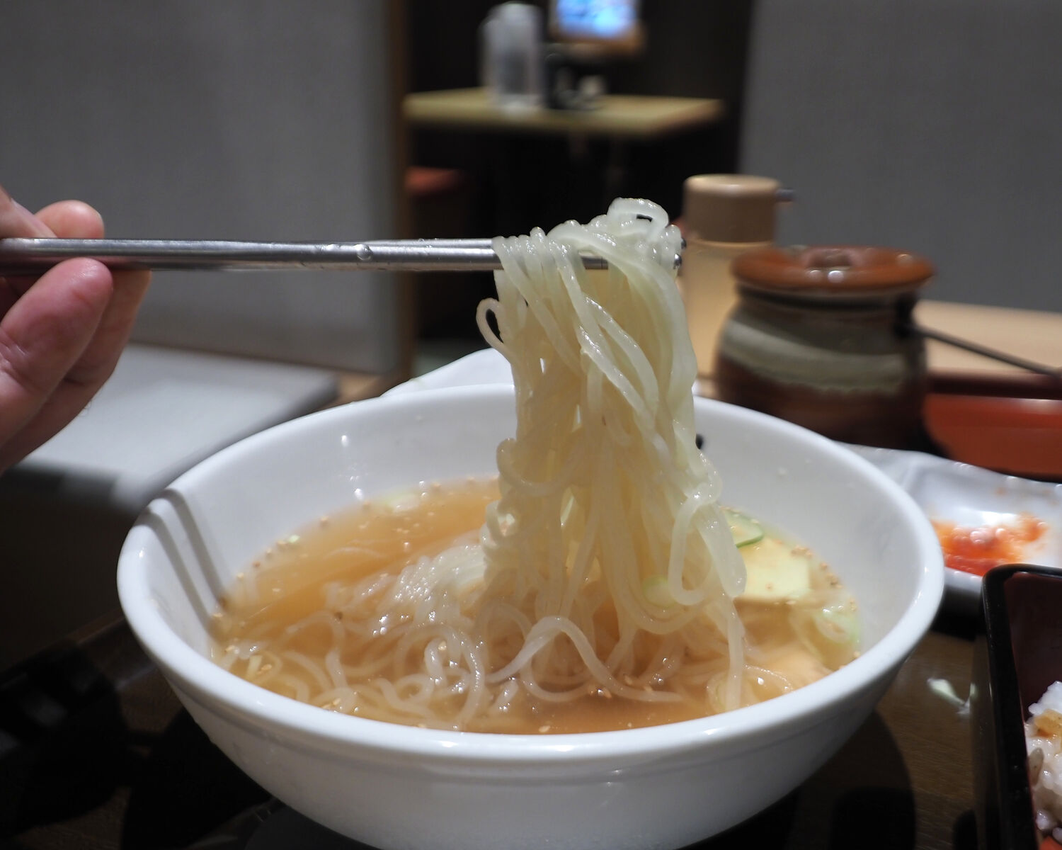 サッパリとしていながらも甘みを感じることができるスープには好みでお酢とキムチを加えることができますし、ツルツルと喉越しが良い麺の歯ごたえも良くいただくことができました