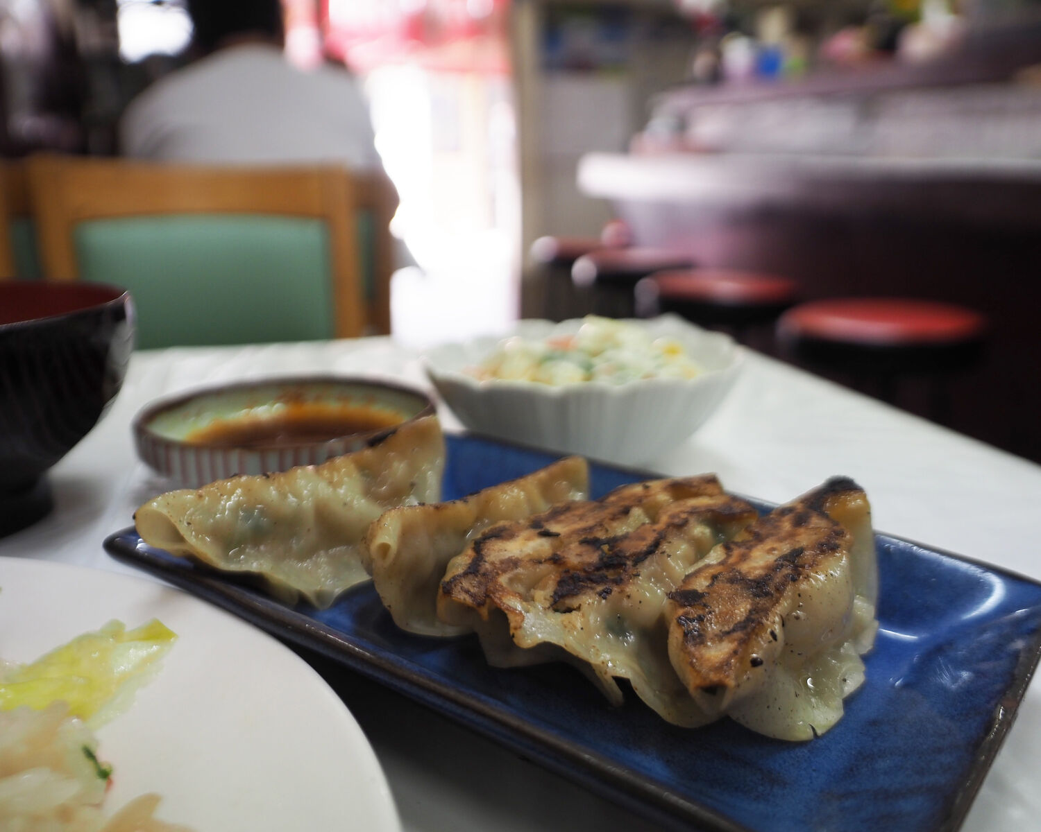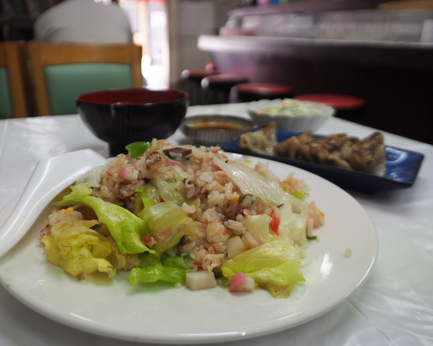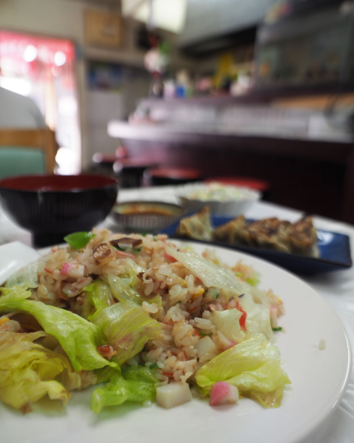 “きたなトラン出演記念”とある「肉天ぷら・炒飯セット」にも惹かれましたが、着席する前に厨房内で餃子を包んでいるところを見かけていたことから「カニレタス炒飯」を餃子5ケとサラダが付くAセットでいただくことにいたします