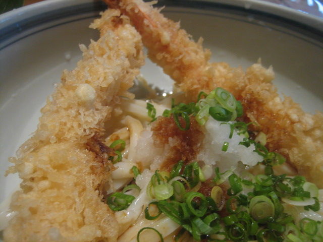 茹で上げの饂飩をサッと冷やし、その上に揚げたての天ぷらを乗せる