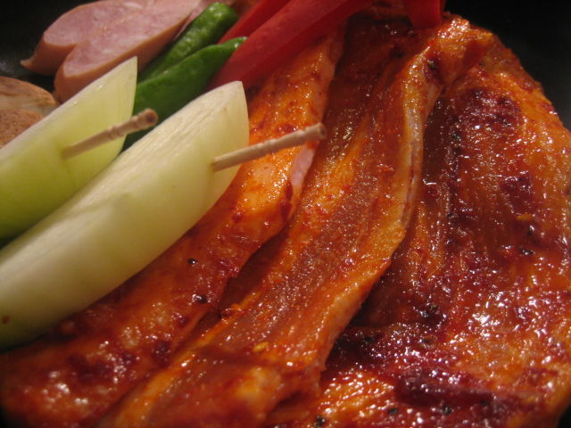 真っ赤なタレで塗された、分厚いサムギョプサル