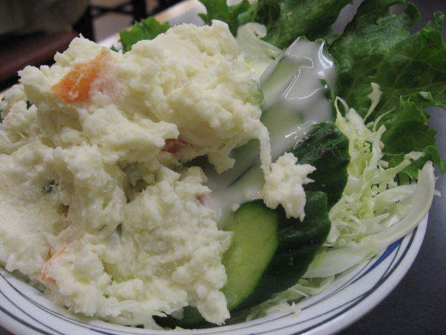 キャベツの千切りサラダの上にドーンと居座るポテトサラダ
