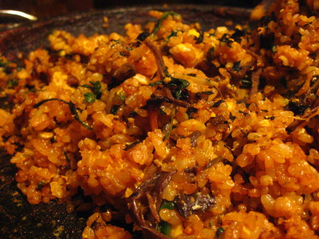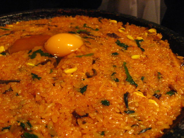 ホルモンや野菜から出た美味しいエキスと一緒に焼き上げるビビンバは格別
