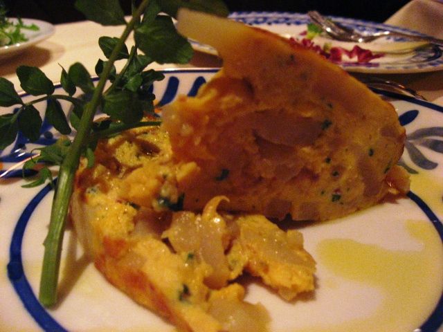 切り分けて出されたオムレツには、ポテトやオニオンなど、具沢山であった
