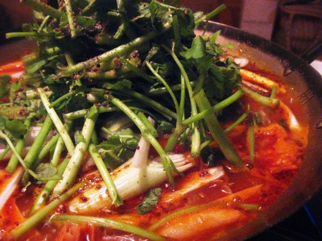 セリがてんこ盛りのなべの中には、ホルモン、蜂の巣、ハラミなどが豪快に入っている