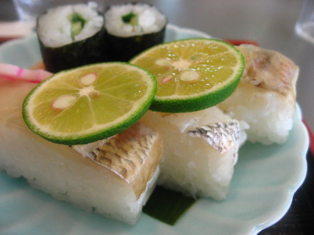 地元で獲れた新鮮な鯛を、軽く酢で〆た押し寿司で、これまた地元の名産である“すだち”を乗せてあります