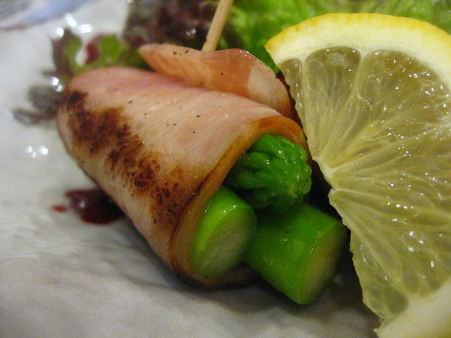 フレッシュなアスパラを厚めのベーコンで巻いてある