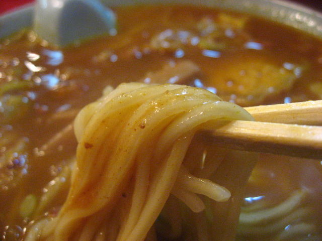 カレーの香辛料と、ラーメンスープの香りが良く合っていて、かなり美味しい