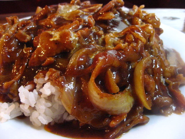 具材はタマネギと肉だけとシンプルなものだが、隠し味に醤油とみりんを使っているらしく、しっかりとしたコクが楽しめる
