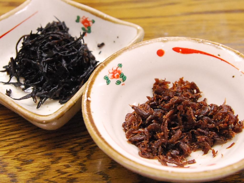 お通し的なヒジキと、ご飯物には添えて出されるアミの佃煮