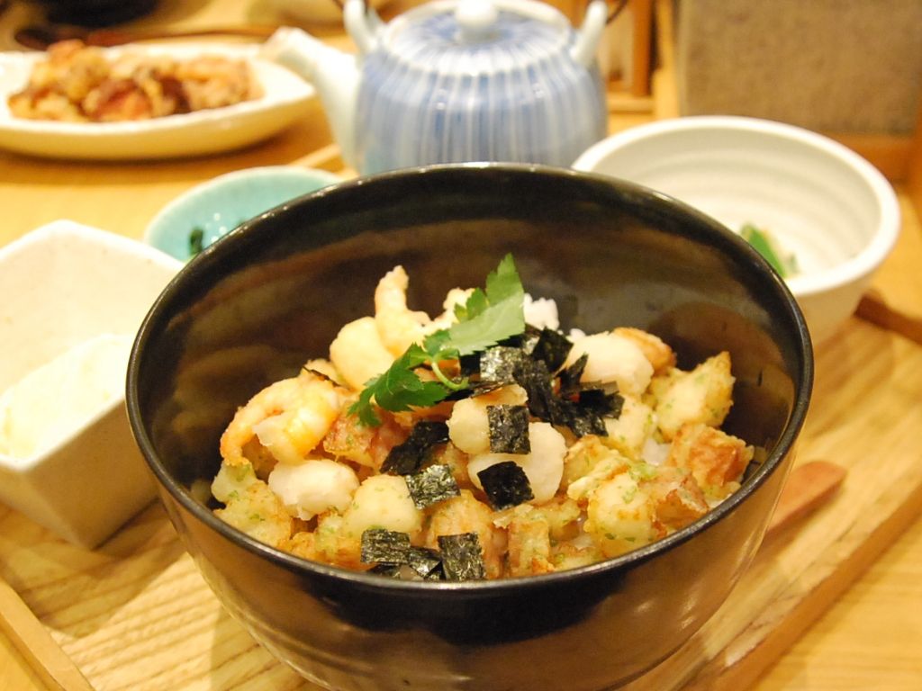 それぞれに薄衣を付けて、天ぷらにしてごはんに乗せる