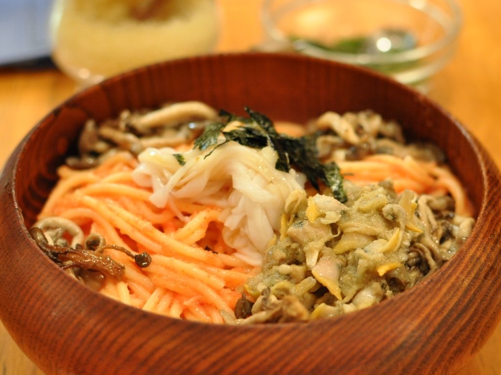 いつもの明太イカに、シメジとアサリをトッピングです