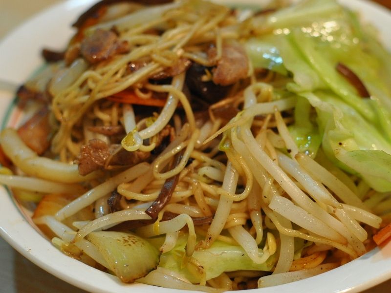 博多ラーメン独特な細いストレート麺をたっぷりの野菜と一緒に炒める