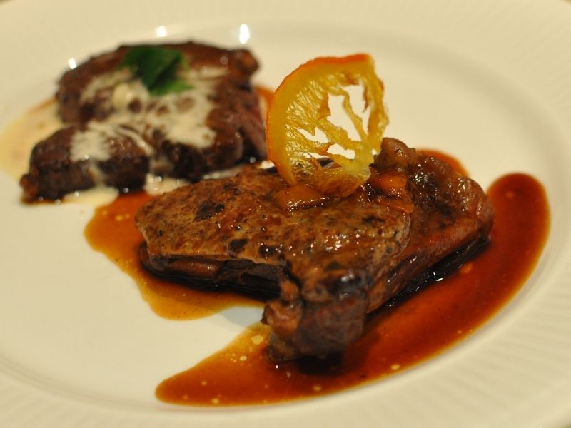 鴨のモモ肉をオレンジソースで煮込んだモノと牛ロースのグリル