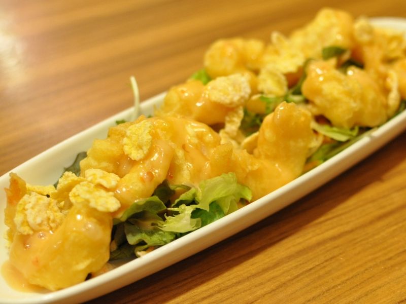 海老のフリッターにオーロラソースを絡めた極々普通のエビマヨが、一口大に切られたレタスの上に盛られただけのもの