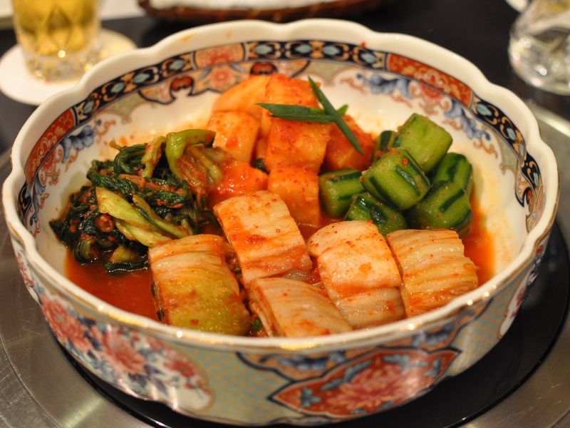 4人で囲むテーブルに一皿 大きなお皿に盛り込まれた游玄亭オリジナルのキムチであります