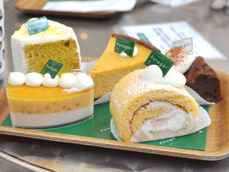 ロールの左にあるカラフルなものがマンゴーキャロット、左奥のノッポさんがカボチャシフォン