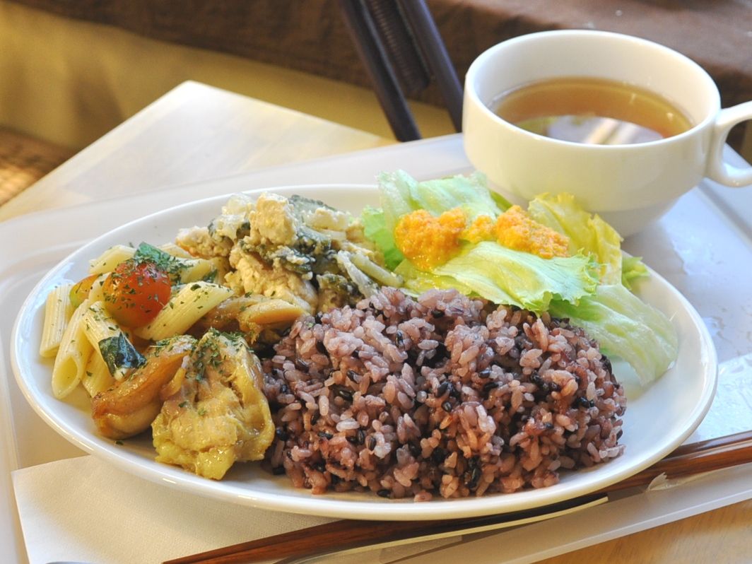 黒米ごはんをベースに、日替わりのメインがひとつ、それにショーケースの中から好きな料理を2つチョイスすると言うモノ