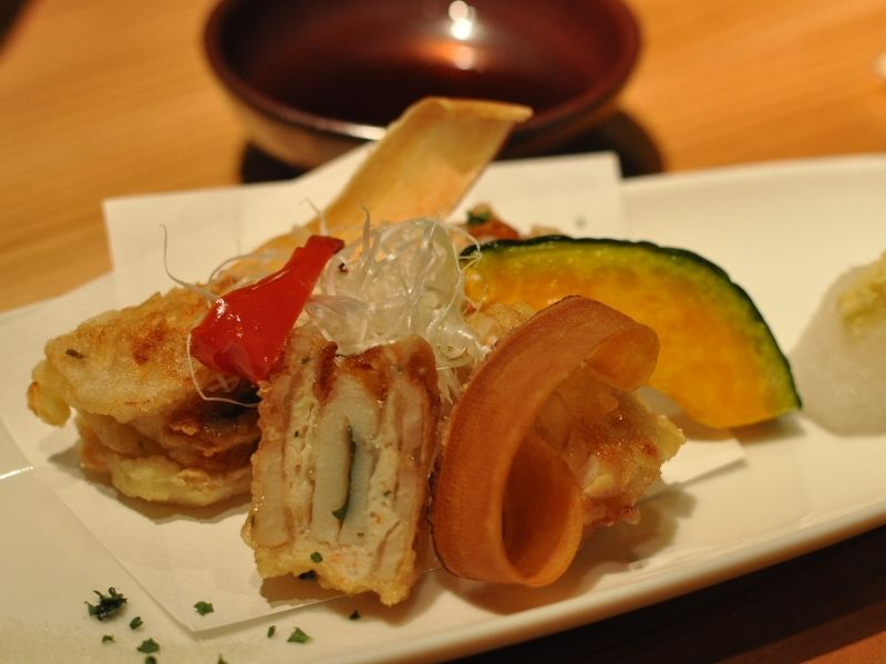 鳴門れんこんのはさみ揚げと阿波尾鶏を使ったもも肉のグリル