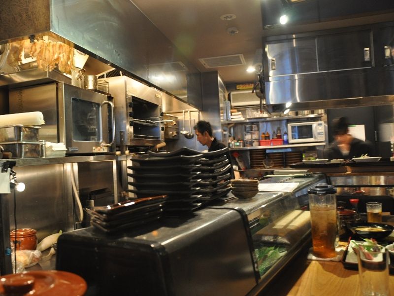 夜が中心のお店でありますから焼酎がすらりと並べられた棚があったり、若いスタッフが一生懸命働く姿を一望できるオープンキッチン