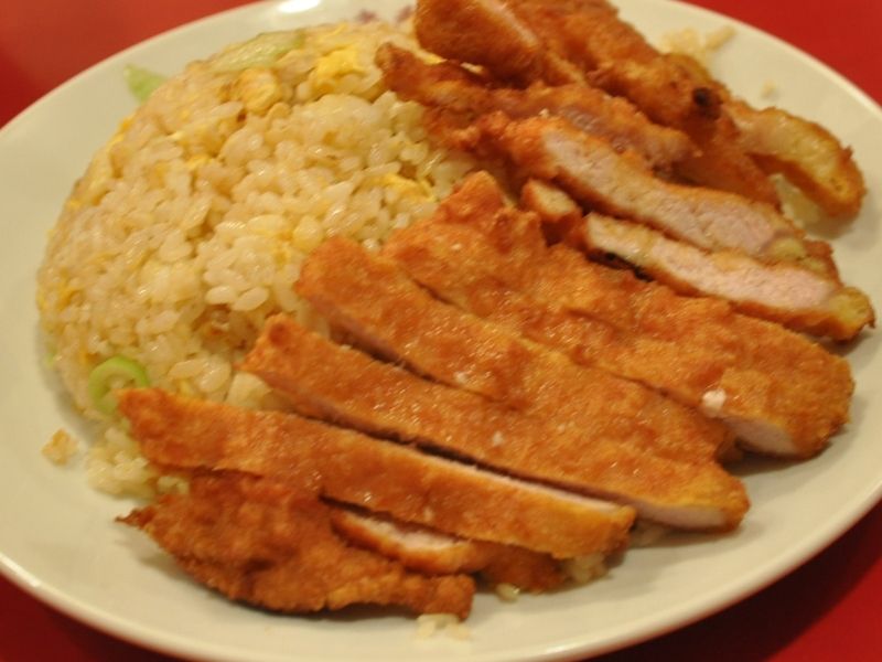 カレー味の衣をまとった薄切り豚の揚げ物が炒飯に乗っております