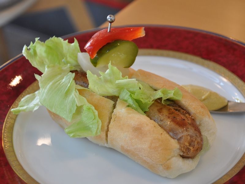 自家製のパンと自家製のソーセージ、それにレタスとピクルスを添えたシンプルなモノ