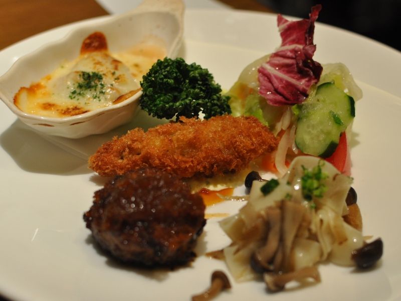 旬である牡蠣のグラタンやフライ、ハンバーグにキノコのマリネにサラダと贅沢でありますね