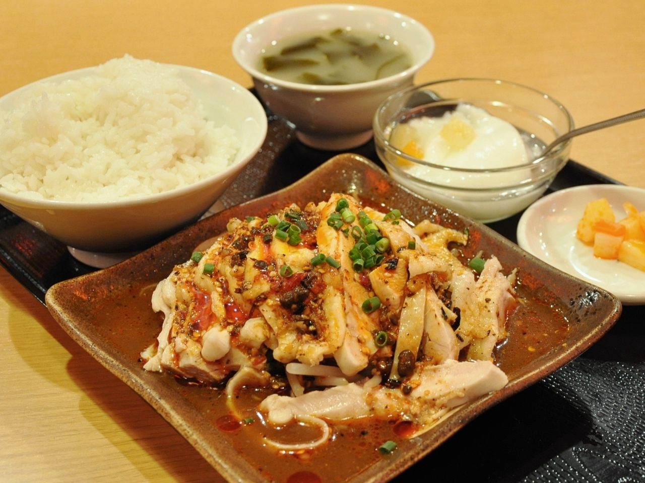 この蒸し鶏は山椒や唐辛子の辛味が効いた四川風