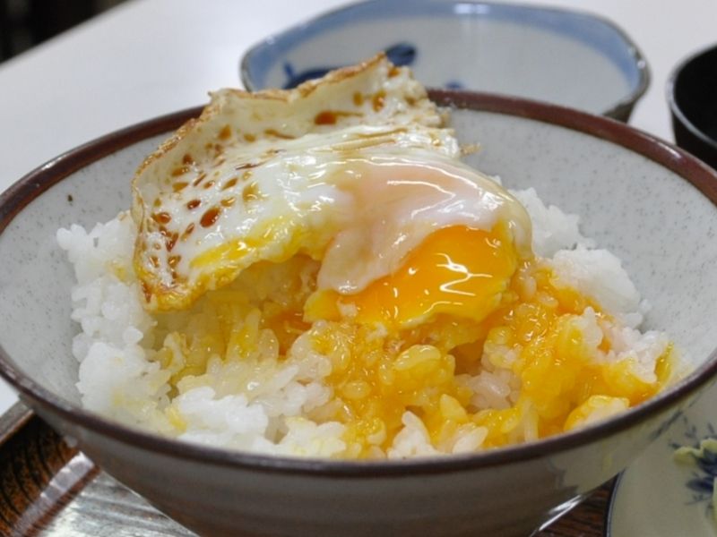 レアな黄身に仕上げられた目玉焼きが提供されましたので、その黄身を流しては勿体無いと、ごはんの上で黄身を潰します