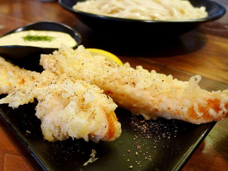 “タルタルソース×サーモンステーキ”と名付けられた、サーモンの天ぷらをいただくことにいたします