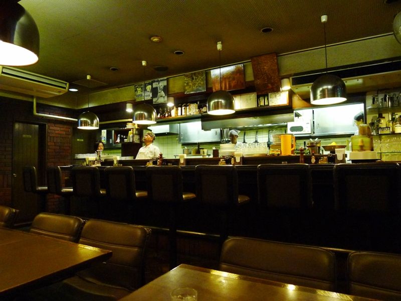 「レトロ」を絵に書いたように重厚なソファーが置かれた店内 厨房へと目を移しますとコックコートにバンダナと言った姿のコックさんがいらっしゃいまして…