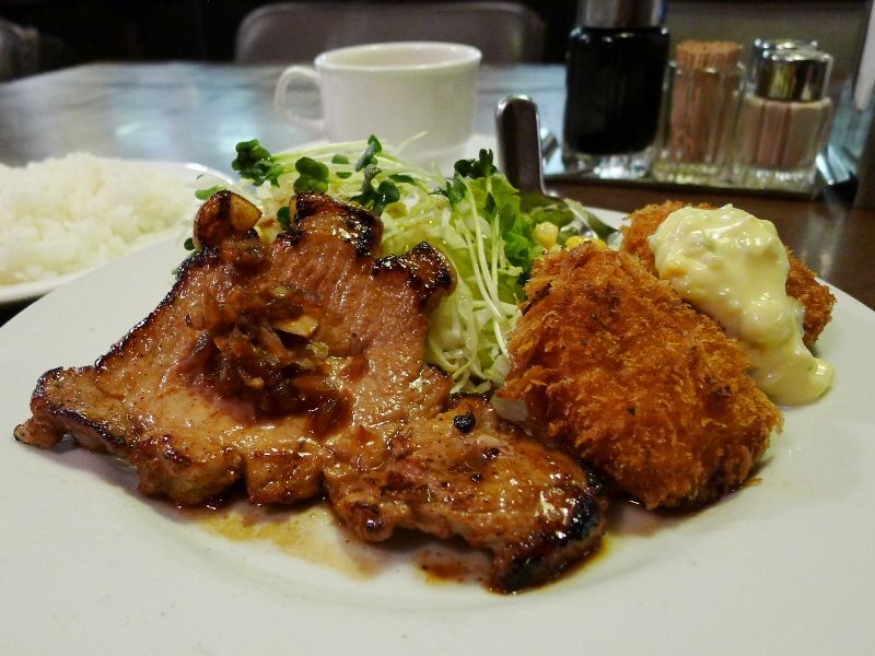 鰻と洋食、どちらにしようかと迷っていますと、こちらの店頭に掲げられたメニューボードに「夏だからこそジンジャーポーク」的なことが書かれていまして、その言葉に後押しされるように入店いたします