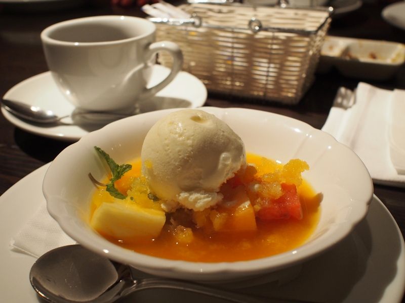 カットされたたっぷりのフルーツとマンゴーソース そこに乗せられたバニラアイスクリームとの相性が素晴らしいモノであります