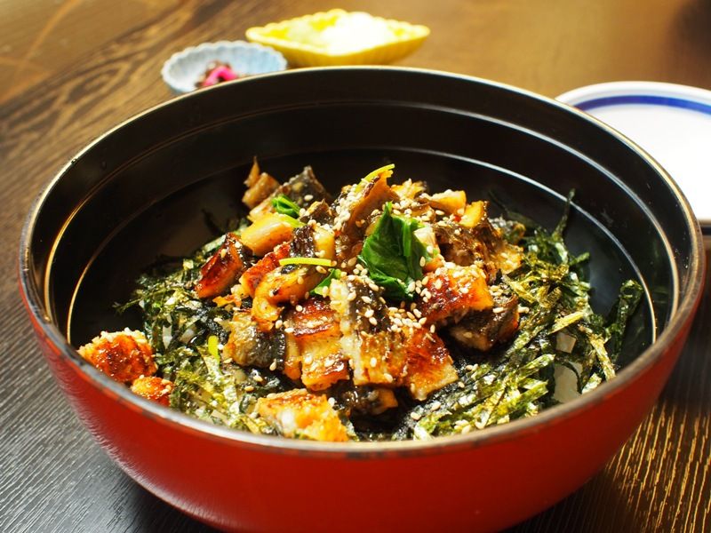 カリッと芳ばしく焼き上げられた鰻を細かく切って盛り付けられた“ひつまぶし”