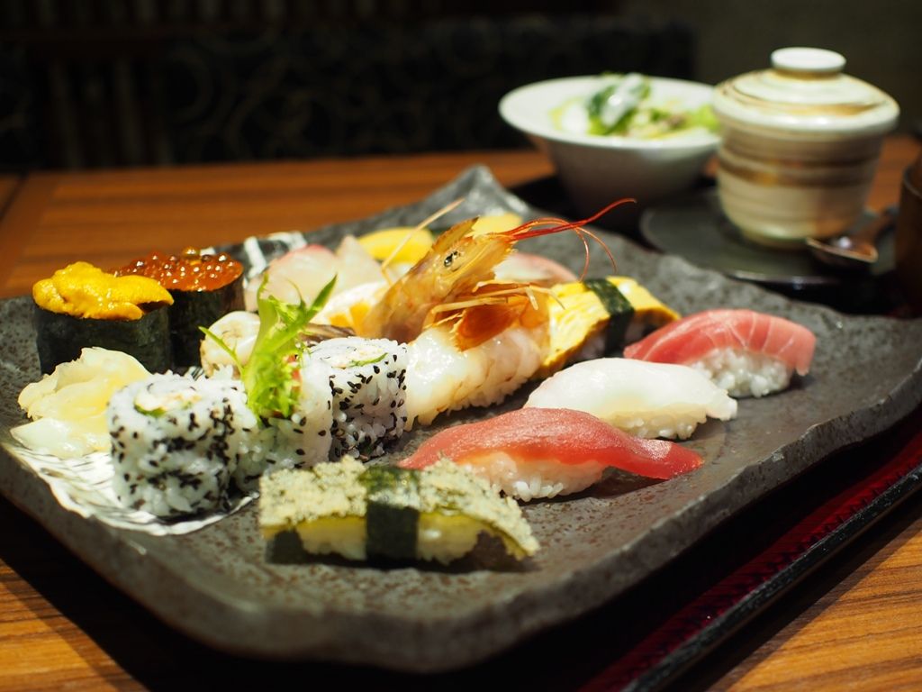 通常の1人前だとちょっと物足りないようで… 1.5人前をお願いしましたので、中トロや車海老、鯛にシマアジ、そしてウニ、イクラと言った軍艦など、13貫と巻物が2分の1