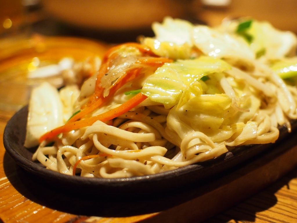 卵を使っていない、小麦粉だけで作られる沖縄の麺、それを野菜と一緒に焼いたものでありまいて、その味付けはソースではなくて塩
