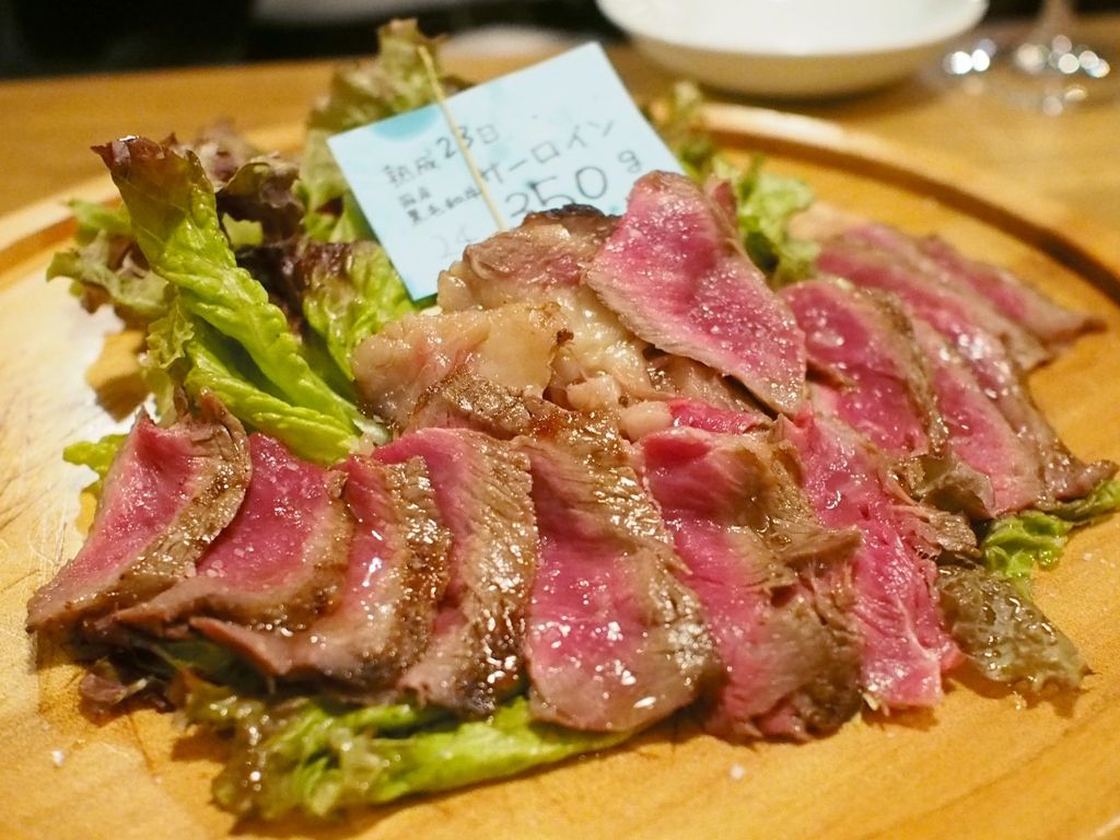 厚切りのサーロインをレアに焼き上げ、それを薄くスライスしていますので、薄紅色の切り口がとってもキレイですね