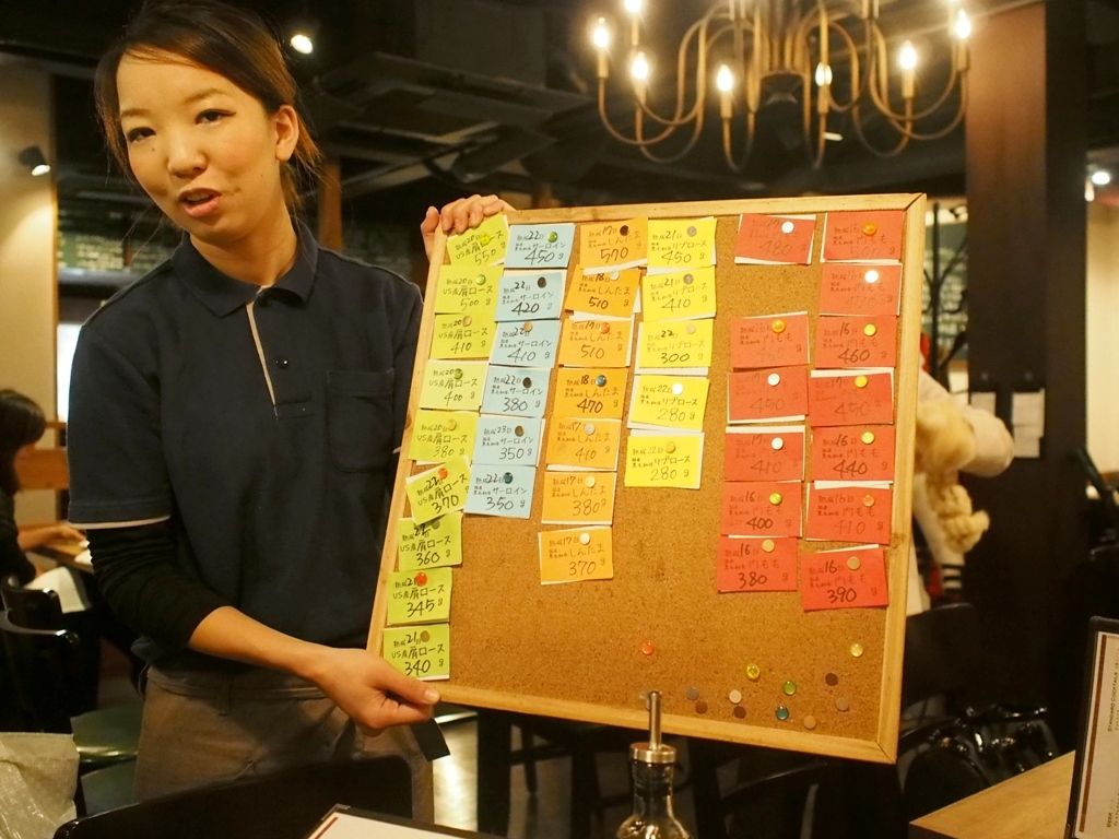 まずこのようなボードを持ってきてお肉の説明をしていただけますし、その説明が食欲をそそるものであるからこそ、多くのお客さまがコレを注文するんですよね