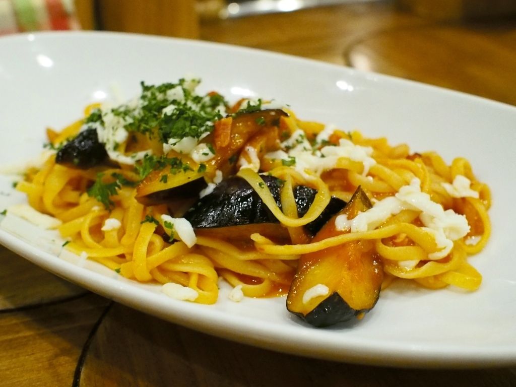 揚げ茄子がトッピングされたトマトソースのスパゲッティをいただいてみますと…