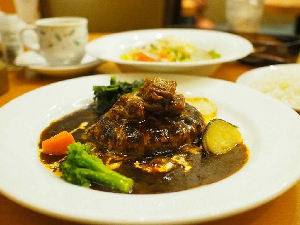 たっぷりのデミグラスソースのとろっとろに煮込まれたお肉がとっても美味しそうなビーフシチューに惹かれ、更にそんなビーフシチューが乗せられたハンバーグを見つけますともう他には目移りすることはありません